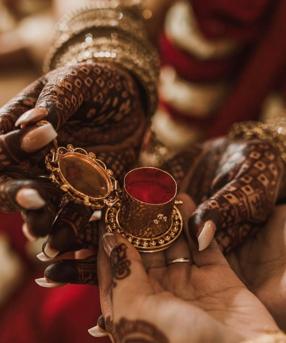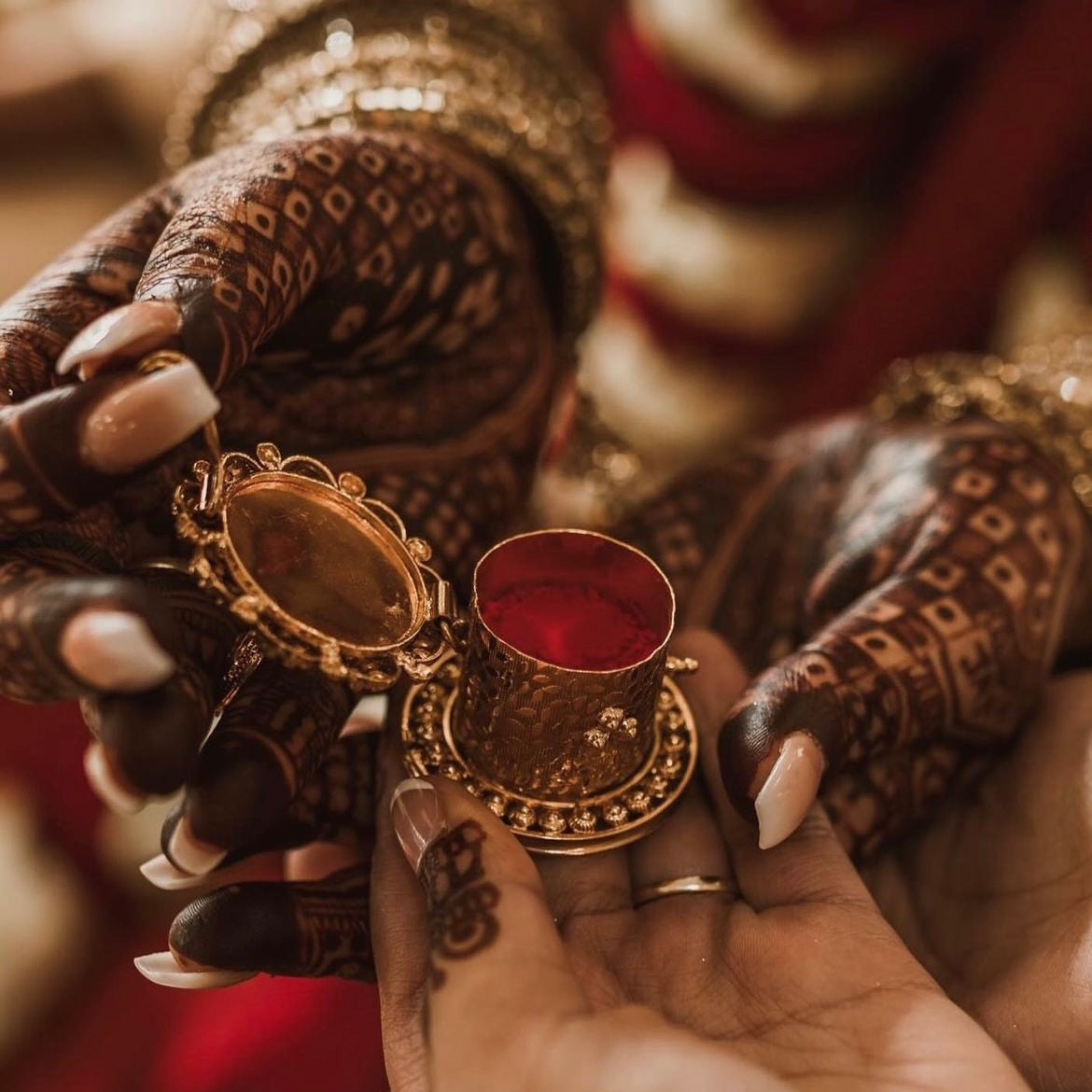 Wij zijn trots op onze uitgebreide collectie en ongeëvenaarde kwaliteit. Het wordt nog waardevoller met de foto's die we van jullie ontvangen, zoals van deze bruid op haar grote dag met onze sindoorhouder!