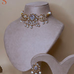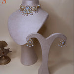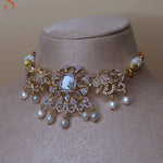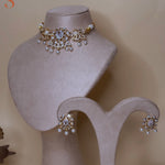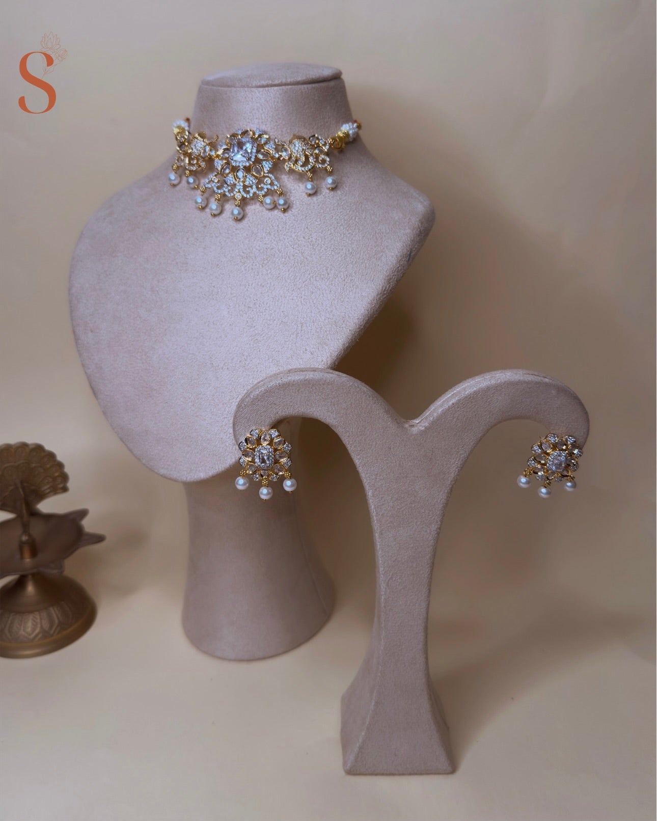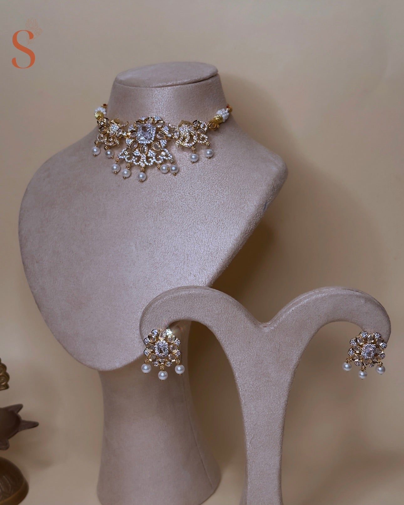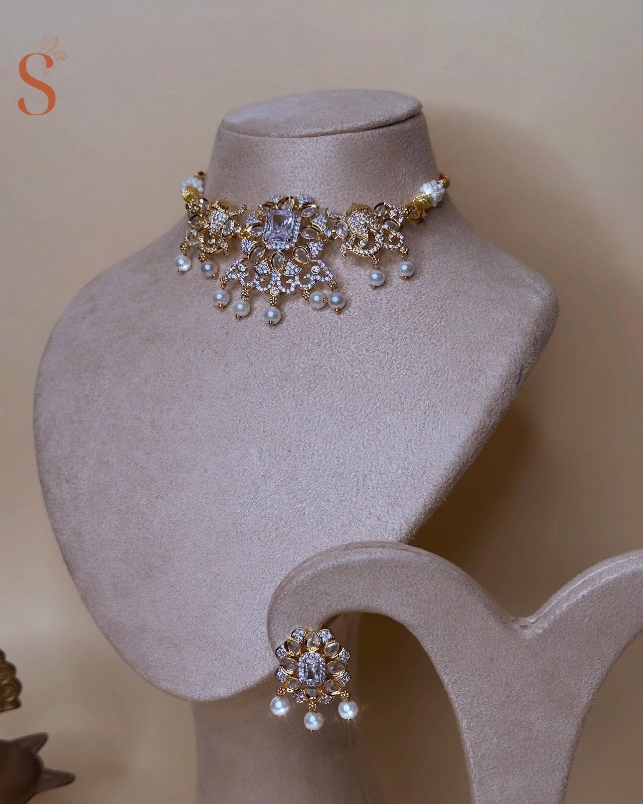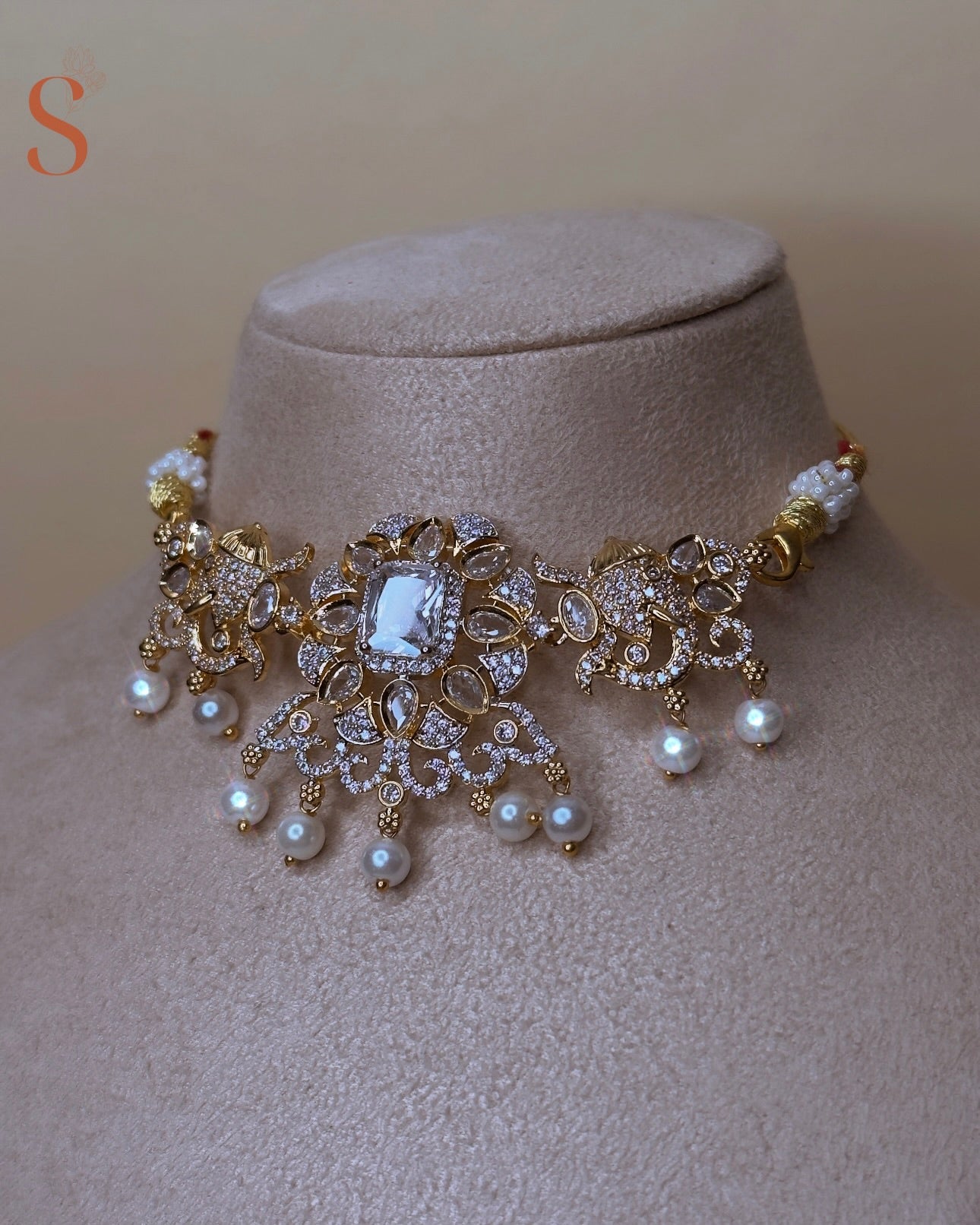 Een chique choker set met goudkleurige afwerking, olifantdetails en een glinsterende steen in het midden. De pareltjes geven een zachte, elegante touch.